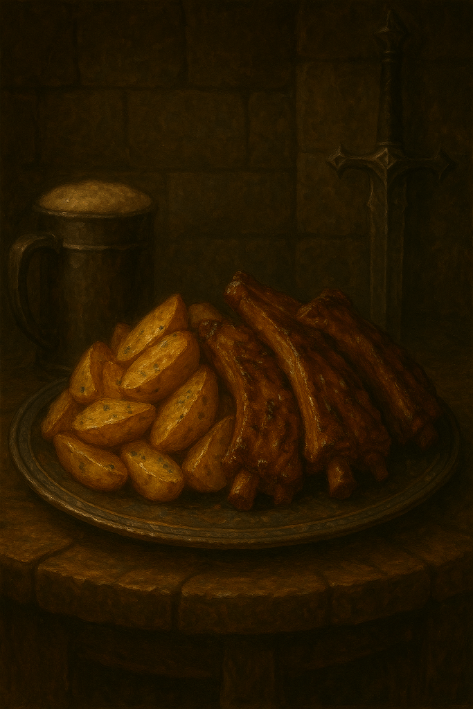 Costine in salsa BBQ al whisky, servito con patate sabbiate & pane